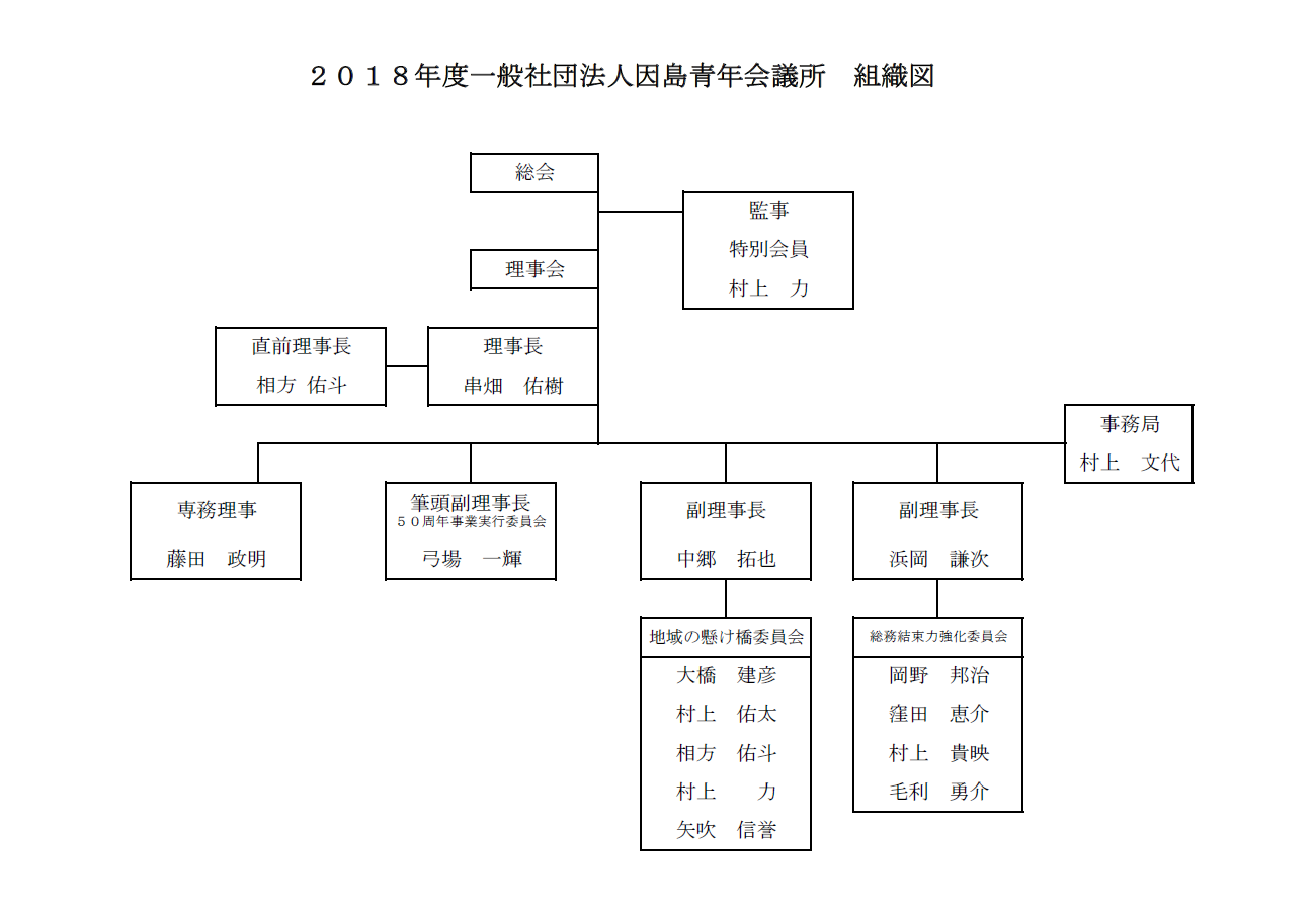 (注)○=委員長 △=副委員長 ・=理事(7名) (公社)日本青年会議所中国地区広島ブロック協議会 出向者 監査担当役員 相方 佑斗 監査担当役員補佐 村上 貴映 監査担当役員補佐 村上 佑太 選ばれる広島創造委員会 委員 村上 力、矢吹 真誉 強い地域創造委員会 委員 窪田 恵介 未来の日本構築委員会 委員 岡野 邦治 次世代育成委員会 委員 大橋 建彦